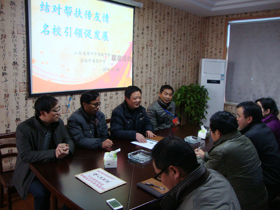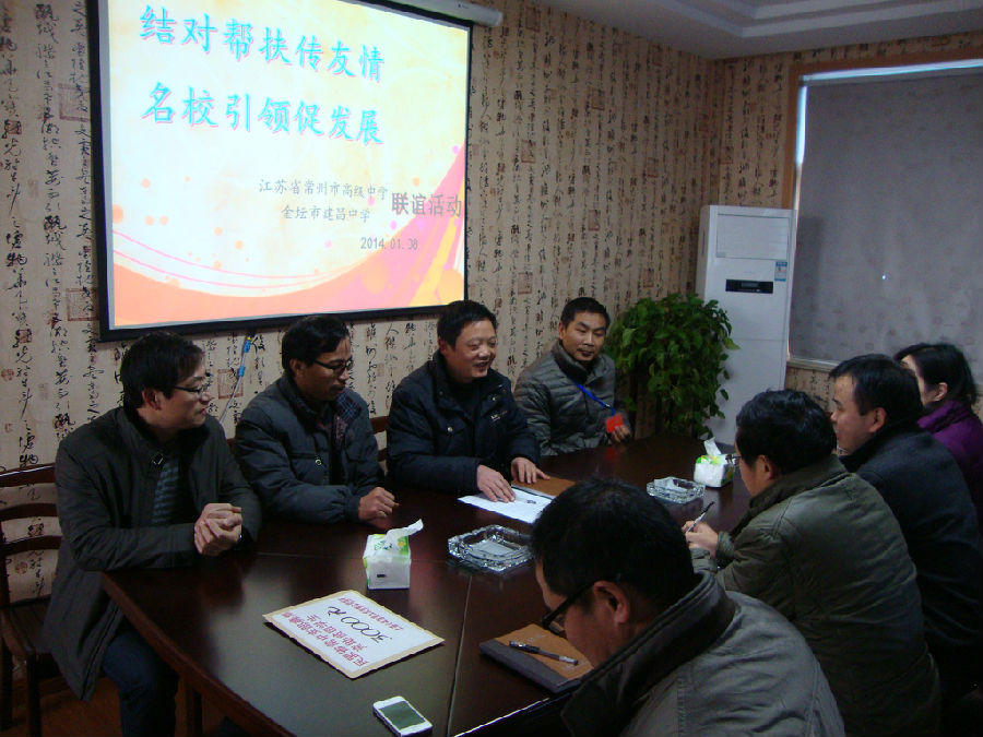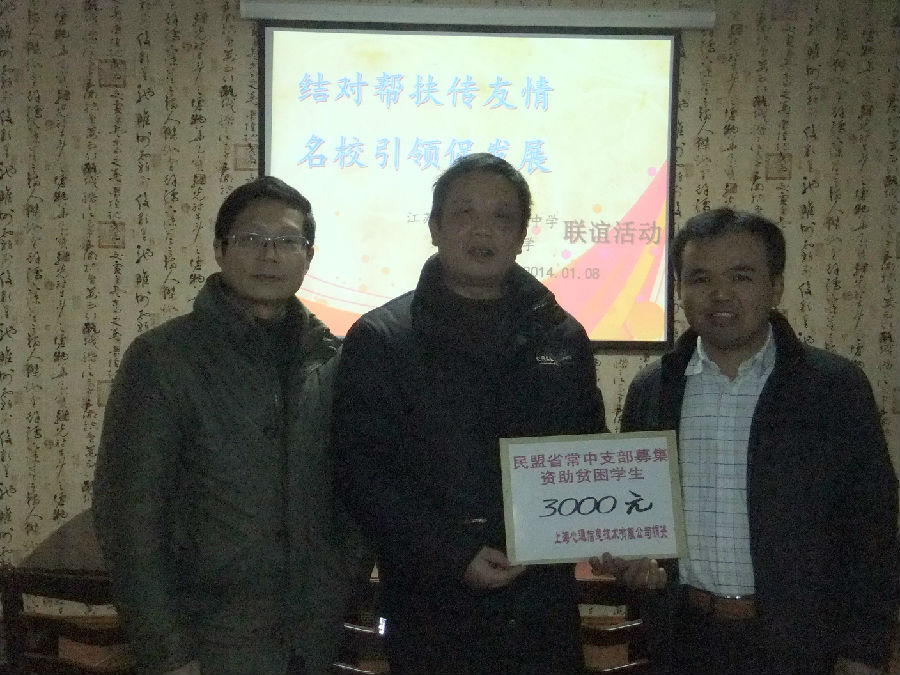 1月8日下午,民盟省常中支部三位委员来到金坛建昌中学,共同商定了2014年结对帮扶活动计划,初步决定,下学期将选派省常中优秀专任教师和教育教学骨干到建昌中学,针对教研组建设、德育工作、课堂教学、信息化建设几方面开设专题讲座;建昌中学将选派部分教师到省常中合作的初中校随堂学习;两校还计划选派部分学生开展“手拉手”学习活动;民盟省常中支部也将持续开展贫困生助学活动等。当天,民盟省常中支部再次向建昌中学的三位贫困学生提供了3000元助学金。(虞力人)
