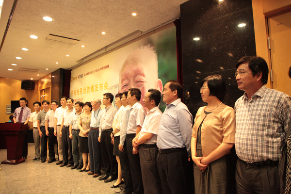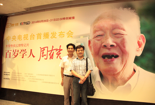 经过一年多的拍摄、制作,4集电视人物传记片《百岁学人周有光》将于2014年8月28日~31日在中央电视台科教频道首播,其他台以后分6集播出。 8月15日上午,该片首播发布会在江苏省广播电视总台举行。省广电总台台长卜宇,中共常州市委常委、宣传部长徐缨,市委常委、统战部长张跃,德彩网市委主委赵忠和、专职副主委黄勇,中科院大气物理研究所研究员、周有光之子周晓平等出席发布会。《百岁学人周有光》摄制组全体人员,周有光的亲友,我市相关部门、单位领导,省市媒体代表共100余人参加发布会。 《百岁学人周有光》总时长近150分钟,以“水韵年华、执子之手、患难与共、结缘字母、大音之魅、多情不老”6个章节,再现了109岁语言文字学家周有光的传奇一生,多维度展示其人生长河中睿智、豁达、开明且充满情趣的故事,全景式展现周有光在经济、金融、汉语拼音等多个领域取得的成就,以及他的智慧人生和长寿之道。解说由《舌尖上的中国》配音演员李立宏担任。 发布会上,徐缨向周晓平赠送《印象常州》画册,表达家乡人民对周老及其家人的一片深情。张跃赠以《百岁学人周有光》拍摄资料并致辞。周晓平向常州赠送父亲周有光使用过的打字机,以及阅读过的有关资料、书籍等。 该片由市委统战部特别策划,市委宣传部、统战部、江苏广播电视总台、常州广播电视台、江苏九洲投资集团联合出品,江苏亚细亚影视制作有限公司和南京电影制片厂共同承拍。 今年,常州市还将在周有光的出生地——青果巷老礼和堂建立周有光图书馆,内设周有光书屋、周有光学术展、周有光专题书库等,力争年底对外免费开放。 周有光出生于常州青果巷,是我国著名语言文字学家、《汉语拼音方案》制订主持人之一。(文/图:李梅香、刘静静)