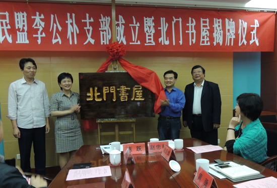 盟员陈汉兴作为主要创办人,介绍了“北门书屋”的筹备情况。“北门书屋”位于常州恒生科技园,目前已收到盟内外热心人士捐赠书籍累计5000余册,今后,将成为全体民盟成员和广大市民免费阅读、学习和义工服务的公益场所。张跃、赵忠和、陶春建、陈汉兴共同为“北门书屋”揭牌。北门书屋原是李公朴先生1942年在云南昆明创办的,专门出售中外名著和进步书刊,同时也是为中国民主同盟组织和进步学生、知识界人士提供聚会的场所。1946年李公朴、闻一多相继被害后,书屋被迫关闭。至今,房屋基本保持原貌,1983年,昆明市人民政府公布其为市级文物保护单位。