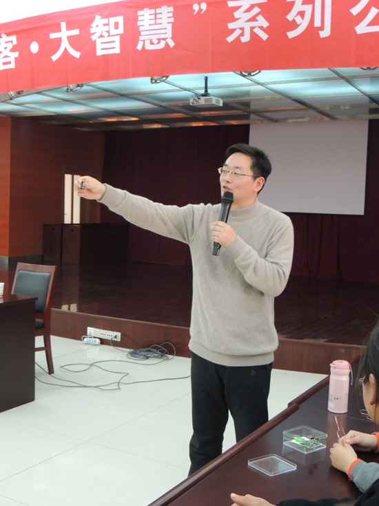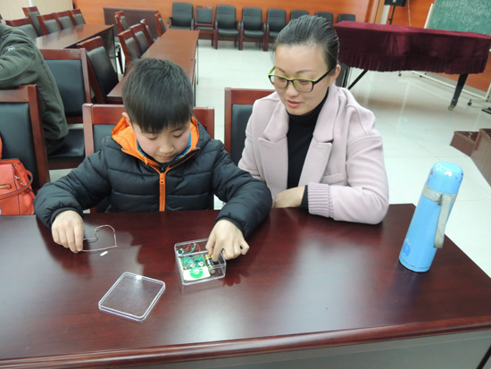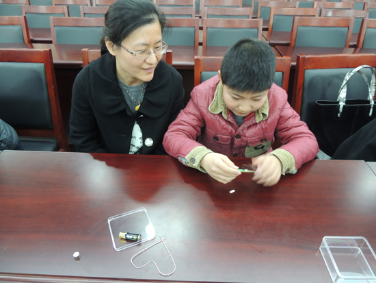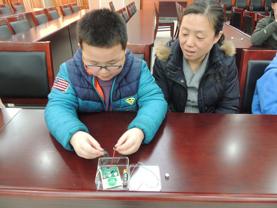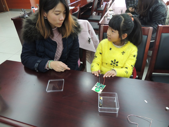 本期讲堂由常州“名教师”管雪沨主讲“三八节送给妈妈的礼物”。14个小学生和1个幼儿园学生在老师的指导和家长帮助下,走进新鲜而神奇的创客世界,他们用电阻、微型录音机等基本零件做成了一个“小魔盒”,“小魔盒”里装有微型录音机,孩子们事先录下对妈妈的祝福或者心里话,作为三八节给妈妈的礼物。孩子们还用电阻、凹成心型的铜丝,以及电池,制作成最简易的发动机,推动心型铜丝自发转动。