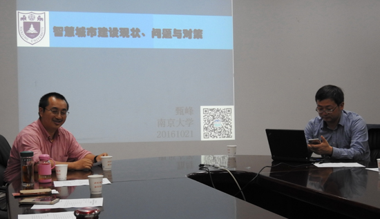 甄峰院长给盟员做了题为“智慧城市建设现状、问题与对策”的专题讲座。他从智慧城市源起、概念与进展;国内外智慧城市建设现状与问题;健康持续推进智慧城市建设的对策与思考等这三个方面深入浅出地与大家分享了智慧城市的创建理念和问题策略。他利用各种研究成果大数据来分析阐述了互联网、计算技术发展下,社会经济的转型和城市规划的转型。智慧城市的概念就是利用新一代的信息技术,以整合、系统的方式管理城市的运行,让城市中各个功能彼此协调运作,为企业提供优质的发展空间,为市民提供更高的生活品质。其核心内涵为“感、传、知、控”。放眼国际,从其它国家的城市的发展中看我们中国的智慧城市发展的可行性和问题。甄院长提出,智慧城市始于人本的需求,凭借的现在技术,终于城市的建设发展。他还和大家分享了智慧常州的发展规划的主要任务为:1、加快信息基础设施建设2、加快统筹信息资源开发和利用。3、扎实推进智慧产业。