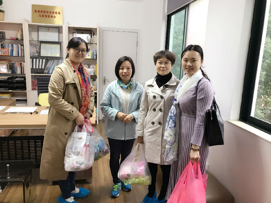 近日,民盟新北综合二支部部分盟员代表冒雨来到常州市新北区向日葵儿童康复中心看望“星星的宝贝”,给孩子们送去美味的点心和。上次来去日葵时她们看到许多孩子训练时用毛巾衬在内衣背后吸汗,这次她们特意给孩子们带来了许多崭新的毛巾。