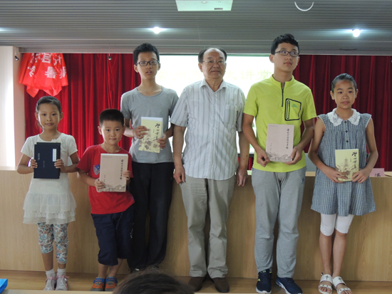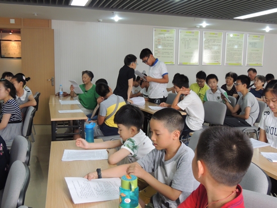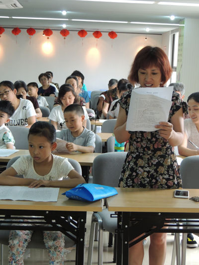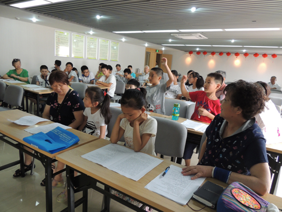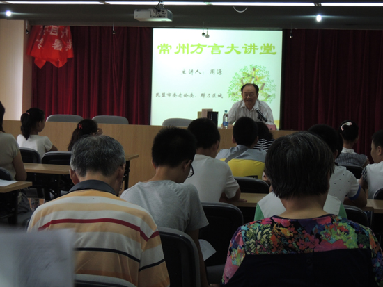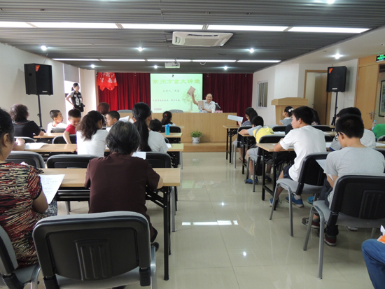 周源作为曾经主持编撰常州方言词典的常州民俗文化方面的专家,一直致力于常州文化的整理保护和推广,在得知社区有意向在暑期推广常州话,非常高兴,欣然接受盟市委老龄委邀请,自己编制讲课稿,难识的字用音标标注读音,方言中无法打印出来的字都用心一个个用笔写上,精心准备一堂精彩的《勿忘乡音会说双语》的讲座。他从常州话的由来以及常州话的发展娓娓道来,希望大家在推广普通话的同时要爱护传承方言,学习常州话,更好地热爱家乡的历史和人文。“日脚”、“说戗落”、“赤括拉新”等地道常州话在互动环节把现场气氛推向了高潮,40多句挑选出来的常州话让大家举手抢答,先用常州话读出来,然后译成普通话,一开始,孩子们还不敢举手,在几位爷爷奶奶带动下,连最羞涩的孩子都高高举起了小手,外来新市民也抢着回答,碰到难度大的句子,老常州、小常州和新常州组成学习小组,一句句学,一个半小时在欢声笑语中飞快过去,孩子们还觉得意犹未尽。