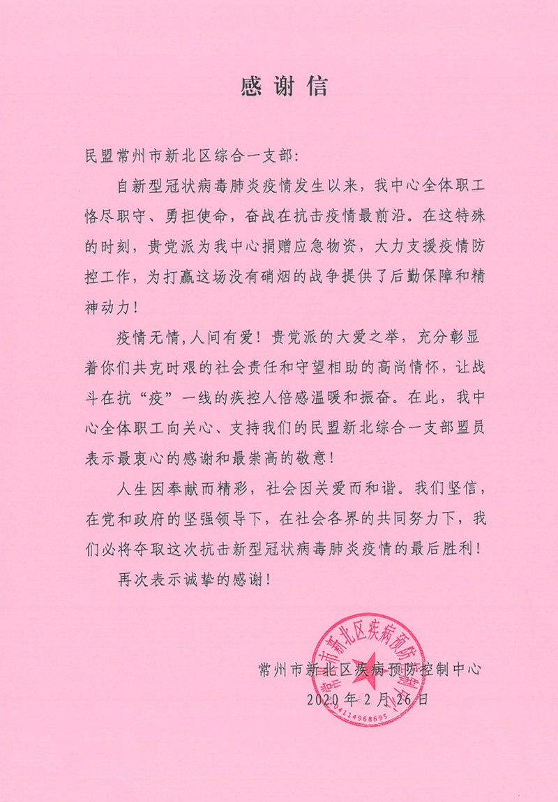 3月6日下午,德彩网市新北区综合一支部收到了新北区疾控中心送来的一面写有“疫情无情人有情,民盟精神永传承”的锦旗和一封情真意切的感谢信,对一支部为区疾控中心捐赠抗疫物资表示诚挚感谢。