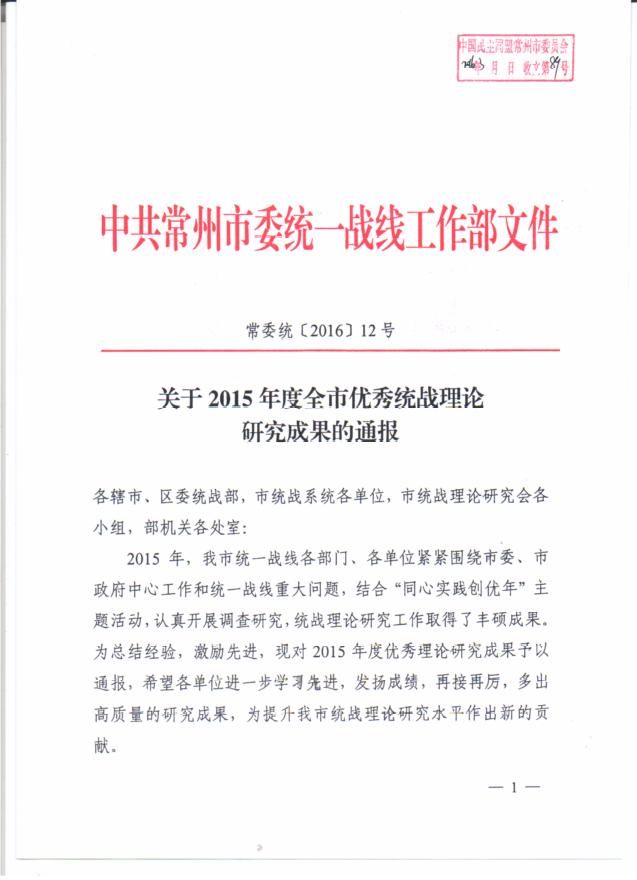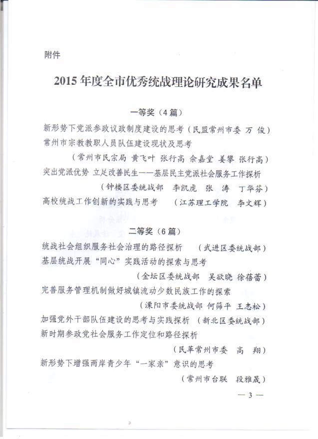 近期,市委统战部、市统战理论研究会对2015年度全市统战系统完成的40余篇理论研究成果进行了评比,其中盟市委递交的课题报告《新形势下加强党派参政议政制度建设的思考》被评为一等奖。 该课题报告由盟市委宣传调研处副处长万俊执笔,通过问卷调查的形式,调查了解当前民主党派成员参与参政议政工作的主要障碍和顾虑,并征集了如何加强和完善党派参政议政制度的相关建议。在课题报告中,运用了大量图表和数据,直观地显示了当前参政议政工作中存在的问题和困境,并阐述了在新形势下进一步加强党派参政议政制度建设的紧迫性和必要性。课题报告的最后,结合了具体工作中的可操作性和针对性,从人才制度、经费制度、交流制度、嘉奖制度、宣传制度五个方面,提出了具体的对策建议。 此外,盟市委组织处李长江参与撰写的《协商民主视角下,人民政协与社会组织关系分析》在此次评比中被评为三等奖。(文:万俊、朱岱君)