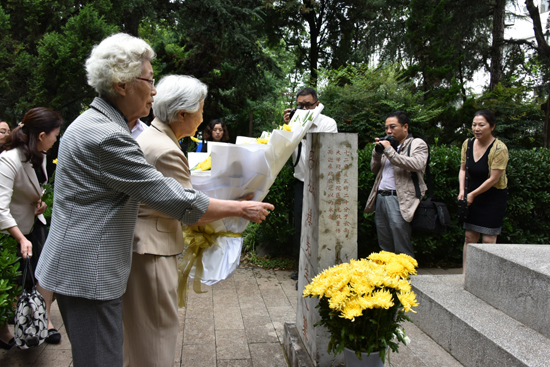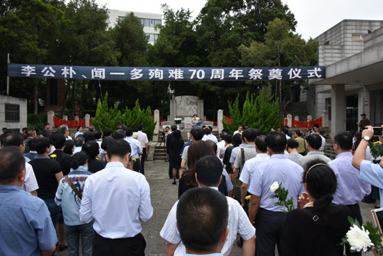 上午10时,全体与会人员来到云南师范大学“一二·一”运动纪念馆前广场,庄重举行李公朴、闻一多殉难70周年祭奠仪式。倪慧芳主持祭奠仪式。在高唱庄严的中华人民共和国国歌之后,全体与会人员向烈士默哀,敬献花篮,行三鞠躬礼并瞻仰烈士墓。德彩网市委主委许峥向烈士墓敬献鲜花。