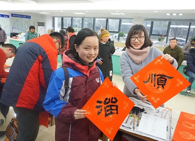 民盟新北区委主委管建国、副主委杨华平、吴小琴,盟员邹琴、杨铭妍、金礼娟、朱婷、吴蝶、龚小仙等积极参与了活动。本次活动还特别邀请了江苏省教育书法家协会理事、新北区书法协会理事丁益兴现场泼墨挥春。一个个洋溢着喜气的“福”字跃然纸上,一幅幅寓意吉祥的春联洋溢着浓浓的节日气氛,吸引着薛家镇新晨社区的居民驻足观看,争相索取,受到了社区居民的青睐,活动现场呈现一派热闹喜庆的景象。