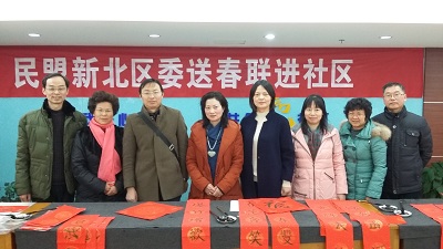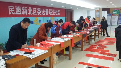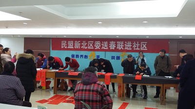 红红春联飘墨香,浓浓情意百里传。民盟“迎新春 送春联 进社区”活动,为社区居民迎接2017年带来了喜庆吉祥的“开年红”,体现了新北区盟员关注民生、服务大众的情怀。本次活动,共为新晨社区居民题写了100多幅春联,送出100多张“福”字。