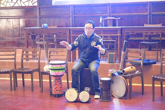 常州市第二中学民盟活动 4月13日下午,常州市第二中学文在楼三楼明德堂内,鼓声阵阵,笑语盈盈。由常州市音协流行音乐专业委员会主席冯琦先生和我校国家二级心理咨询师、注册催眠师朱元琛老师联合组织的体验式音乐放松工作坊在我校首次活动,正式试水。 本次活动我们请来了被笑称为“鼓痴”的冯琦先生,他先从自己收藏的上百种从中东到拉丁美洲各种类型的鼓说起,康佳鼓、邦戈鼓、对话鼓、巫毒鼓、宝丝蓝鼓、海洋鼓……参与活动的老师们都大为惊诧,原来打击乐也有这么多种类型。一人收藏这么多鼓,在常州,估计没有第二人了。“把自己的爱好当成自己的事业,一直是我的理想,现在,我的这个理想实现了。”冯琦先生一边钻研收藏来的各种小打击乐器,一边从事打击乐的教学工作。 在教师当中,打击乐器属于非常小众的音乐。“大家最熟悉的小打击乐器就是非洲手鼓,对其他的鼓类知道的比较少。”老师们说。冯琦先生介绍说,在鼓类中,非洲手鼓属于比较容易上手的小打击乐器。“在非洲,玩手鼓要和其他非洲鼓类一起玩,不同的小打击乐器一起演奏,形成‘鼓圈’,那才是原汁原味的非洲鼓。” 冯琦先生用海洋鼓和三角铁作为背景音乐,现场为大家表演了各种小打击乐,其中许多都是老师们第一次见到。律动的节奏,优美的鼓声,老师们都如痴如醉,跟随鼓点摆动起来。冯琦先生说,最高兴的是见到喜欢的鼓,并把它买来进行演奏,但有一种鼓令他望而却步。这种鼓叫塔布拉鼓,属于印度鼓。据冯琦介绍,塔布拉鼓即使能买到,也不容易学到。“这种打击乐器的演奏方法是通过口口相传的形式教授的,或是通过拜师学习,或是家族传授。” 紧接着一曲《The sky》 把大家带入空灵的境界,朱元琛老师让老师们闭上眼睛,平静地呼吸,放松双肩,倾听后请每位老师谈谈听了音乐的感受,并且一一点评。她告诉大家,有节奏地鼓点,会带人进入一种境界,放空自己,沉下心来,进入冥想,是非常适合教师的一种放松方式。她进一步阐释,音乐不仅是一种声音,而且是一种状态。幸福感是音乐给人的最大作用。 “音乐,比语言更直接更多元,每个人理解的范畴更自由和广阔。音乐、绘画、话剧等都是一种表达性艺术,有时候我们并不会去寻找朋友倾吐自己的烦恼,而是在内心世界,通过沉浸在这些艺术欣赏和创作中,由一种自发的,不刻意追求的情绪情感带来内在态度的修通!”朱老师睿智总结,再次引发老师们的一致赞同。活动后,老师们都希望以后经常开展这类活动,在享受美的同时,进行心理治愈,对高压下的老师非常重要。 (徐蕾)