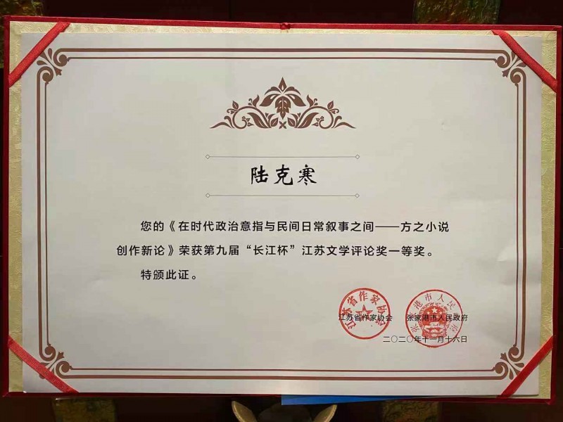 11月16日晚,第九届“长江杯”江苏文学评论奖在长江文化艺术节闭幕式上隆重颁奖,德彩网工学院基层委主委、常州工学院人文学院教授陆克寒的作品《在时代政治意指与民间日常叙事之间——方之小说创作新论》荣获第九届“长江杯”江苏文学评论一等奖。 据悉,“长江杯”江苏文学评论奖是由省委宣传部指导支持,江苏省作家协会、张家港市人民政府共同于2010年设立的省级文学评论奖,是江苏省唯一的省级文学评论专项奖。该奖旨在通过评选、表彰优秀文学评论作品,进一步发挥文艺批评引导创作、多出精品、提高审美、引领风尚的重要作用,推动全省文学事业健康发展。 该活动已连续举行九届,每届设一等奖两名,二等奖、三等奖若干。(周丽)