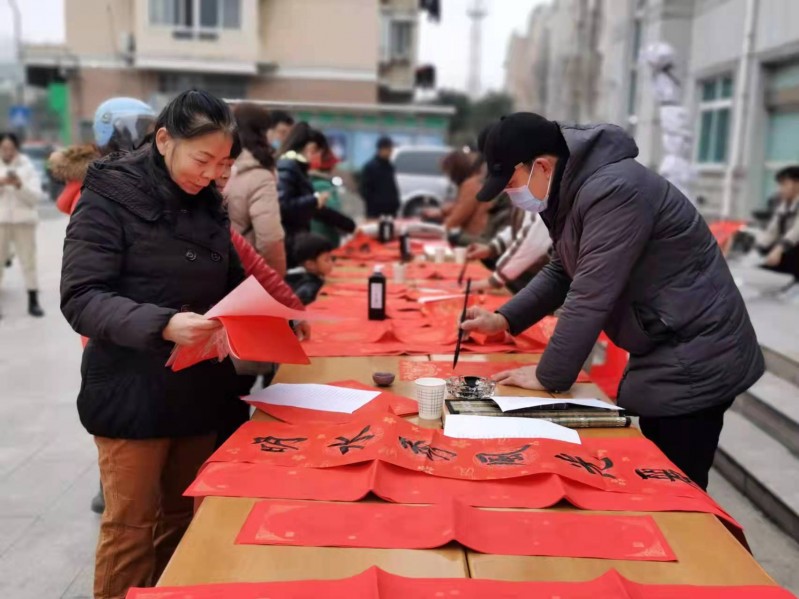 现场,红纸铺展,墨香四溢。钱鹏、薛丽娜、濮如等十位老师现场挥毫泼墨,用一副副春联和一张张“福”字,为社区居民送上最诚挚的新春祝福。“虎添双翼前程远国展宏图事业新”“虎跃龙腾生紫气风调雨顺兆丰年”“虎啸青山千里锦风拂绿柳万家春”……,只见书法老师们屏息凝神,熟练地挥动着手里的毛笔,行云流水、一气呵成。不多时,一副副散发着清新墨香的喜庆大红春联和“福”字便呈现在人们眼前。古方社区的居民听闻活动的开展,纷纷前来观看,并挑选自己喜欢的春联带回家。有的市民还自己找了春联请书法老师写下来,“量身定制”的春联赢得大家的由衷好评。创意书写的“福”字更是一字难求。大家一边欣赏书法创作,一边品评春联寓意,现场洋溢着一派欢乐祥和的气氛。弘扬传统美德,传递社会正能量,民盟李公朴支部在行动。此次活动,市民盟的十位书法老师共为过往社区居民免费书写春联100余副,“福”字300有余。这“文化年货”延续着节日的传统、传递着浓浓的祝福。