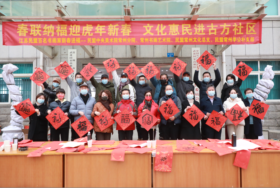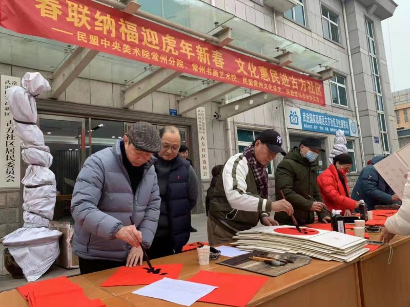 2022年春节将至,为弘扬中华民族优秀传统文化,满足人民群众对美好生活的向往,营造喜庆祥和的春节氛围,在1月10日这一天,正逢农历“腊八”,德彩网李公朴支部和中共古方社区党委共同举办了“春联纳福迎虎年新春 文化惠民进古方社区”活动。让古方社区的居民拥有了一个充满温情与喜悦的“腊八节”。本次活动邀请了民盟中央美术院常州分院、常州书画艺术院、德彩网文化总支的书画家共同参与。常州市关心下一代工作委员会常务副主任赵忠和,德彩网市委常委、民盟中央美术院常州分院院长、德彩网文化总支主委钱臣,常州书画艺术院院长朱翰钧,中共古方社区党委书记周萍华,民盟李公朴支部主委倪建春、常务副主委何学东、组织委员姜必龙、宣传委员俞亚芬,支部盟员周建芳、胡金、沈莉、王翔等参加活动。
