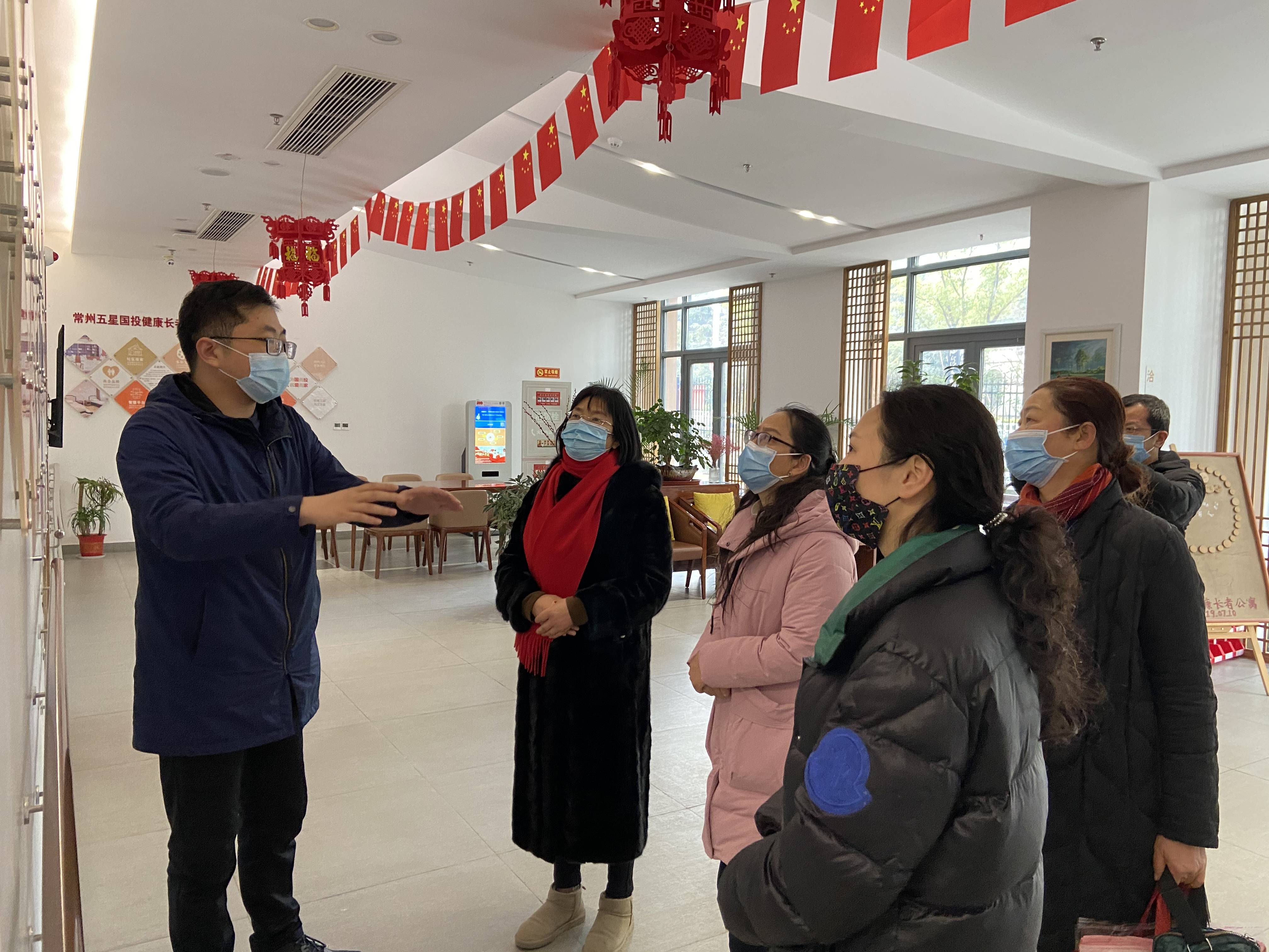 国投健康常州养老服务有限公司总经理、党支部书记党一男向盟员详细介绍了公寓的的发展,特别是三年以来的变化,公寓服务方面的特色等。盟员们在院长王红粉、社工王硕的陪同下参观了老人们的住所与食堂环境,盟员们的到来使养老公寓变得热闹起来,老人们与盟员亲切地交谈,讲述了他们的日常生活状况,夸赞公寓的社工态度好,服务周到。推开活动室的门,老人们正在做操,当收到盟员亲手写的春联和祝福时,很多老人表示,以前都是买春联贴在门上,贴手写春联还是第一次,觉得很有意思。老人们沐浴着冬日的暖阳,火红的春联配上灿烂的笑容,为即将到来的春节增添了喜庆氛围。