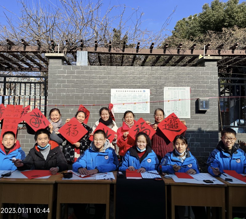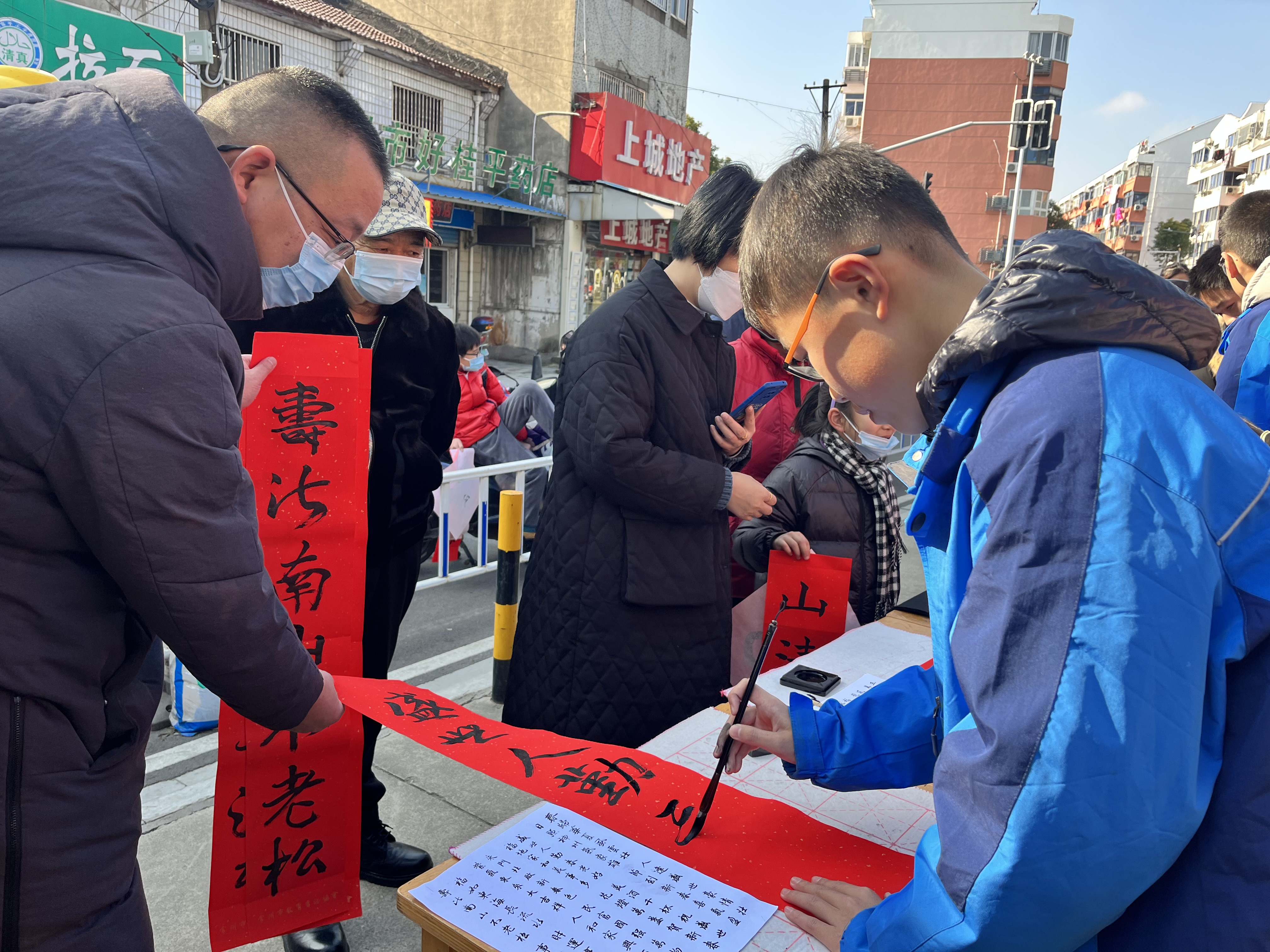 1月11日上午,民盟花园中学支部组织学校的小书法家在花园新村社区,为社区居民写春联、送祝福。