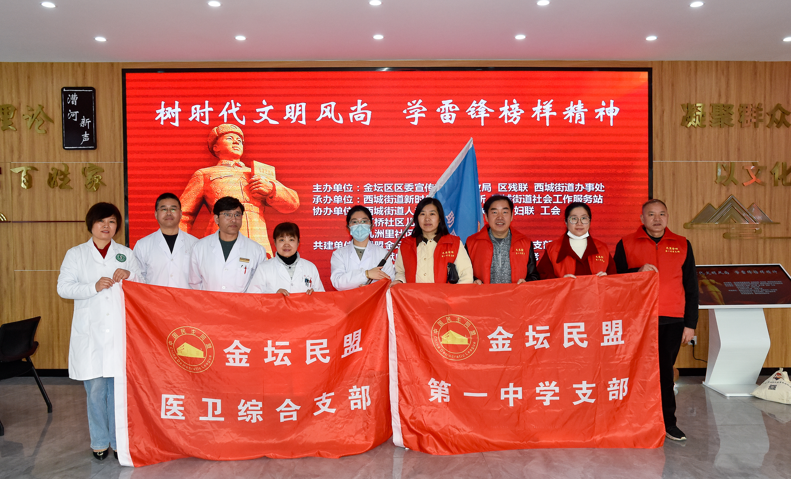 ——金坛民盟医卫综合支部、金坛一中支部进行助医、助学大型活动 雷锋精神是我们中华民族宝贵的精神财富。六十多年来,它激励着一代又一代人的健康成长。3月5日上午,在金坛区区委宣传部、区民政局、区残联、西城街道办事处主办的“树时代文明风尚·学雷锋榜样精神”主题教育月的现场活动中,民盟金坛医卫综合支部与金坛一中支部于西城街道新时代文明实践所进行了助医、助学大型活动。 庄重的授旗仪式在隆重、热烈的气氛中开始,金坛医卫综合支部陈淑玲主委、金坛一中支部田永忠副主委从区民政局、西城街道办事处领导手上分别接过“助医志愿服务队”“助学志愿服务队”旗帜,并承诺一定用无怨无悔的志愿者精神传承雷锋精神,引领社会进步,弘扬正能量,发挥我们民盟的力量。 在陈淑玲主委的组织和带领下,一支由支部盟员组成的医疗服务队在现场展开义诊活动,大家为前来健康咨询的居民耐心、专业的解答并做保健科普,医疗服务队上门对长期卧床病人进行慰问、问诊以及康复指导。 二楼活动室,一中支部的盟员们在田永忠副主委的带领下展开助学活动。他们为“儿童关爱之家”的孩子们精心准备了一套经典书籍,并开展了一系列的助学活动。田副主委表示,下阶段支部将继续跟进,持续开展关爱留守儿童的活动。 本次活动,得到了主办方的认可,更是得到了街道居民的赞赏,医卫综合支部、金坛一中支部以雷锋同志为榜样,将学习雷锋精神为百姓做实事落到了实处,同时树立起民盟基层组织的良好形象。 (张燕萍)
