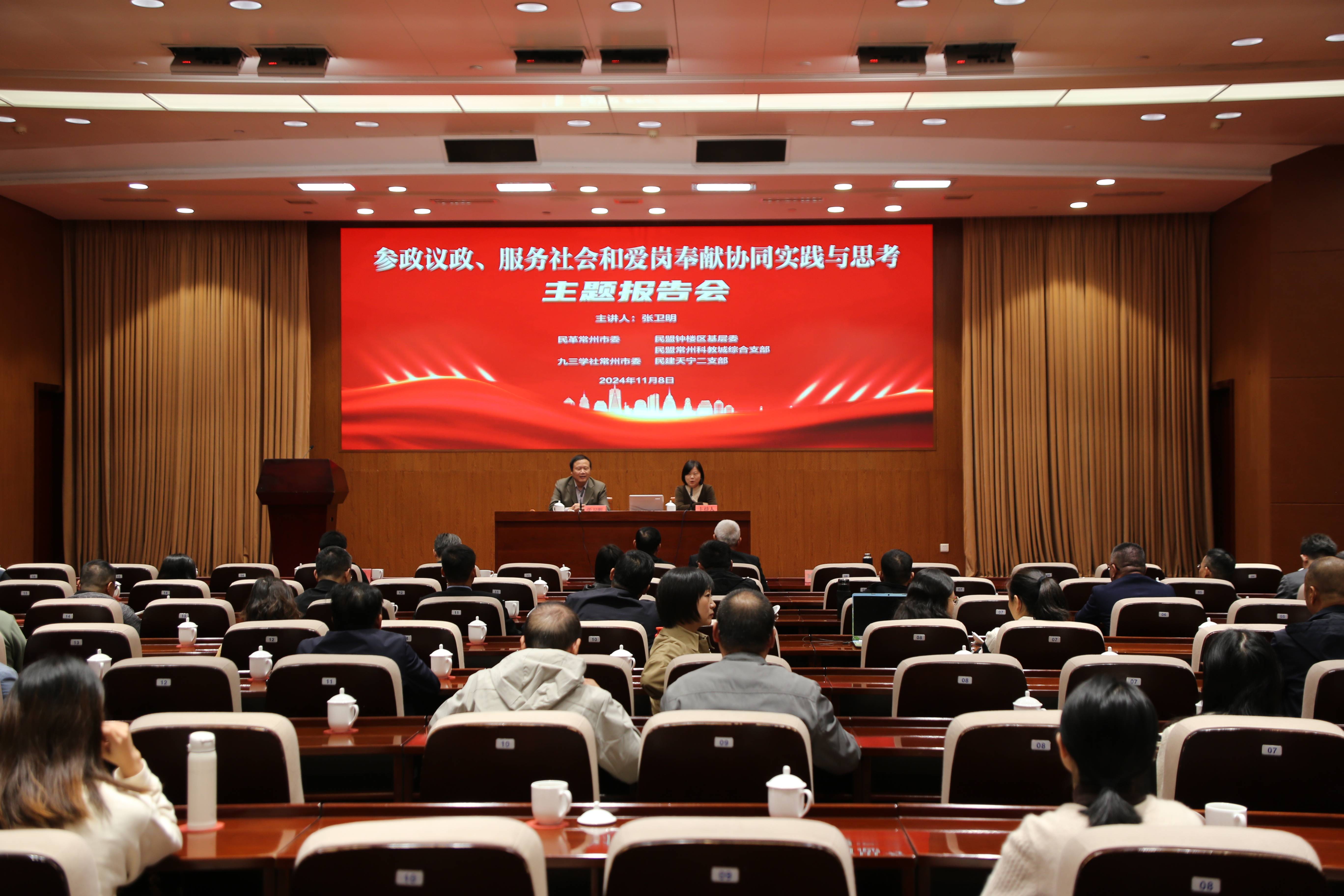 11月8日下午,民盟钟楼区基层委和德彩网科教城综合支部联合举办参政议政讲座,九三学社常州市委、民革常州市委和民建天宁二支部等参加讲座,130余名民主党派代表聆听报告。德彩网科教城综合支部主委臧科慧主持讲座。 活动特邀博士生导师、国务院政府特殊津贴专家、南京同仁堂健康药业集团首席科学家、中国标准化专家委员会委员张卫明做客常州,作题为《参政议政、服务社会和爱岗奉献协同实践与思考》的报告。在一个半小时的主题报告中,张卫明从介绍自己的三农情结说起,以本职工作、参政议政、社会服务三者有机结合的视角,从自己参加工作、加入民主党派、成为市、区人大代表的经历展开,向大家生动讲述了成长为科研骨干,并担任院领导的历程。他的介绍体现了一名新时代人大代表认真履职的感人故事和为民情怀,体现了民主党派人士的时代担当和双岗履职的生动实践。 主题报告在听众们热烈的掌声中圆满结束。大家表示要以张卫明这样的楷模为榜样,深入学习贯彻习近平新时代中国特色社会主义思想,增强“四个意识”、坚定“四个自信”、做到“两个维护”,向先进楷模学习,用新时代的新作为践行多党合作的初心和使命,为实现中华民族伟大复兴的中国梦贡献智慧和力量。 (臧科慧)