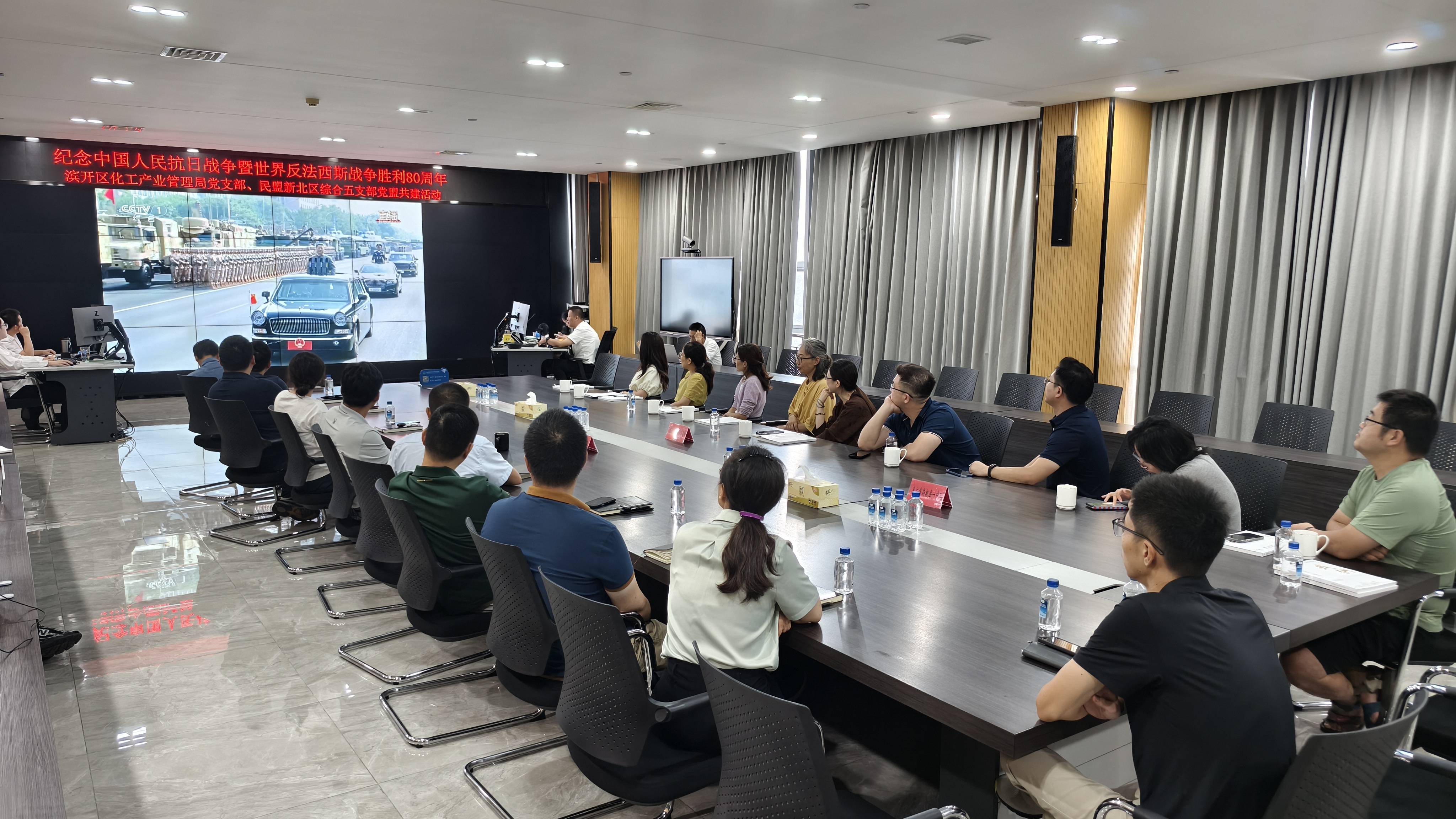 为纪念中国人民抗日战争暨世界反法西斯战争胜利80周年,9月3日上午,德彩网市新北区综合五支部与常州滨江经开区化工产业管理局党支部在滨开区管委会联合开展“党盟共建·铭记历史”主题活动,集中观看在北京天安门广场举行的盛大阅兵式,并围绕弘扬抗战精神、推进党建与盟务融合进行交流研讨。